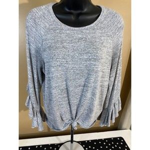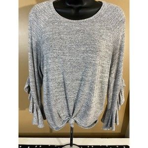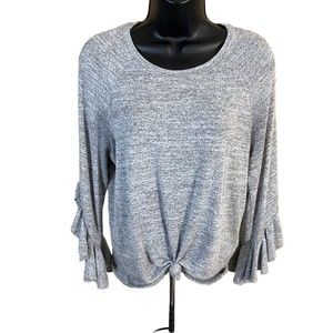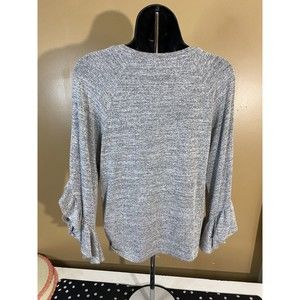 This Banana Republic women's blouse in size XS features a round neckline and long, flared sleeves with ruffle accents. The solid gray color and lightweight cotton material make it a classic and versatile addition to any wardrobe. Ideal for casual or dressy occasions, this top is a basic style that can be dressed up or down. Perfect for women who love a timeless and chic look, this blouse from Banana Republic is a must-have.
