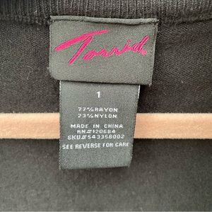 Great condition! Worn & washed a few times. Some pilling but mainly in armpit area. Keyhole circular cutout. 3/4 sleeves. Light, thin sweaterlike material. Stretchy. Torrid size 1 is equivalent to a 1X (14/16) according to Torrid size chart.