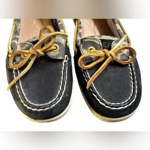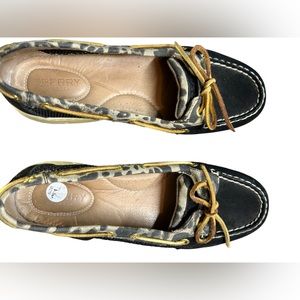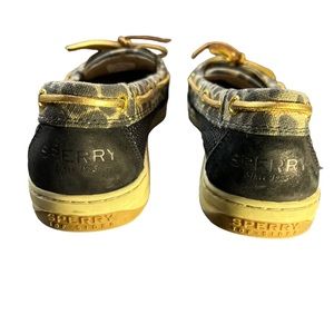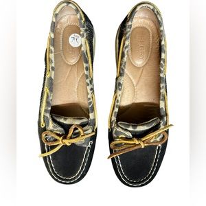 SPERRY Angelfish Black & Gold Animal Print Slip On Boat Shoes Size 7.5. EUC.