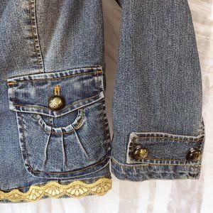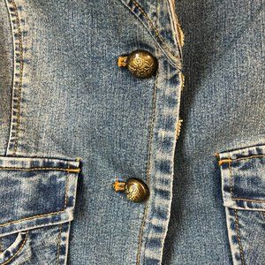 Pre-loved – no significant signs of wear. • Denim blazer with ¾ length sleeves • Lace and brass button details • Tag Size: 2 Approximate measurements taken lying flat: Bust 17”/Waist 15”/Length from Shoulder 20”/Sleeve Length 18” • Fabric: 75% Cotton/23% Polyester/2% Spandex Reasonable offers are welcome. Thank you for shopping my closet!