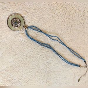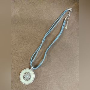 I found this gem at a thrift shop. It's practically in brand-new condition, with the rope chain having no tears or frills. The enamel color is sea-green (1st & last photos are most accurate color-wise), and it has filigree and little stones culminating in a lovely flower. I've no idea how old this is, probably late 90s just due to the tag style. But I've never seen any like it, and I know 1928 pretty well. Truly a one-of-a-kind find.