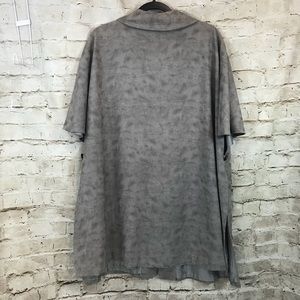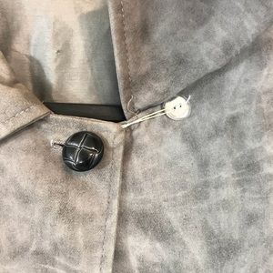 Has Batwing sleeves. Side openings are held together by a dark gray button