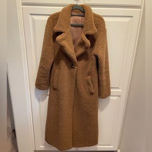 Must have coat this season! Super soft to the touch. Sherpa look and flat collar detailing will elevate any outfit. A longer hem, allows the coat to be paired with either short or long dresses. It is an essential piece for the cooler season. Worn once - in perfect condition. Made in Italy.