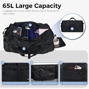 🧿Large Capacity & Foldable: This foldable duffel bag has a large capacity of 65L and can be fast folded into a really small size. Unfolded size: 24.5 x 11.5 x 14 in, Folded size: 10.24 x 9.06 in. It can be used as a "Just in Case" bag to avoid extra baggage charges