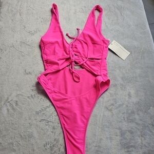 65.🆕Large New Hot Pink Sexy Cutout Lace Up Backless High Cut One Piece NWT