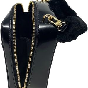 •Faux patent leather with faux fur trim