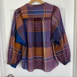 MADEWELL Boho Plaid Button Down Oversized Peasant Top with full blouson puff sleeves. Color: Beacon Faded Eggplant /brown, blue, orange. Perfect for fall / autumn / winter. 100% Cotton.