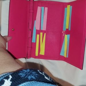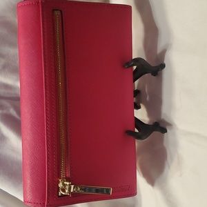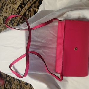 BNWOT- This is a Gorgeous Hot Pink Leather Crossbody Bag. Wallet section has snap closure. There's plenty of card slots for Most of your cards lol. BNWOT: No Markings or Scratches. No Stains or Rips. It has a long Crossbody leather strap. Bag can be used as a Shoulder bag or Crossbody. You'll love it, I'm sure. Lots of Space for a Wallet size bag. Large exterior pocket w/gold-toned zipper closure.