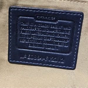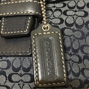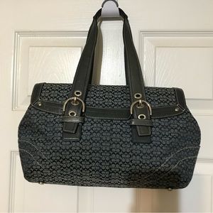 COACH F12312 Large Soho Flap Satchel Bag. Dark blue and black mini Coach Signature pattern on jacquard canvas. Black leather trim and handles.