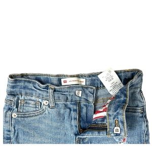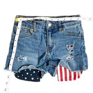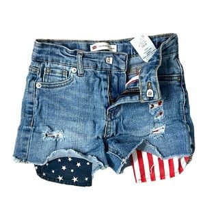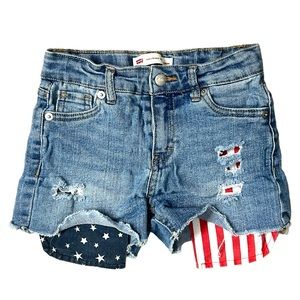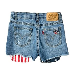 Girls Levi’s Blue Jean Shorts With American Flag Pockets - Size 6X. Adjustable waist with distressed patter so you can see the American flag pockets. Raw frayed hem. Shorts are in great preloved condition! Measurements are in pics, however additional measurements available upon request.
