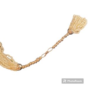This vintage necklace features cream-colored sea glass beads with carved bovine accents. The beaded style is perfect for adding a bohemian touch to any outfit. The necklace is made of high-quality materials, including the sea glass and bovine accents. It is a one-of-a-kind piece that is sure to turn heads.