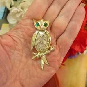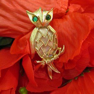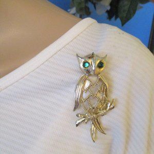 Detailed and dimensional, this adorable owl is constructed of smooth and textured silver-plated metal, with an openwork belly, sculpted to show realistic feathers, ear tuffs, and branch wood. Mother of Pearl backing peeks through on belly. Two round, green glass cabochons are hand-set for the eyes.