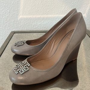 Tory Burch- grey leather round toe heel w/silver metal double T logo.