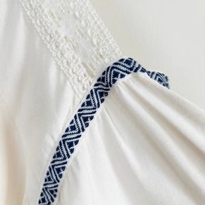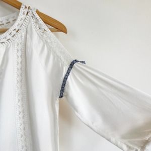 This Romeo + Juliet Couture cold shoulder dress can go from the beach or pool to happy hour. Cold shoulder lace trim bell sleeves. Fringed split neckline with navy blue tassel tie. Lightweight rayon fabric.