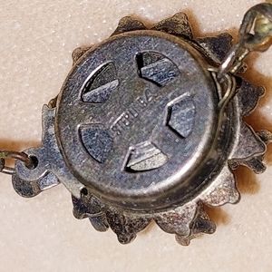 Fancy Sterling silver clasp with sparkling diamond like crystals makes this glass pearl necklace extra special. The clasp is marked STERLING for solid sterling silver not plated. The glass pearls are in very good vintage condition, and the clasp is secure.