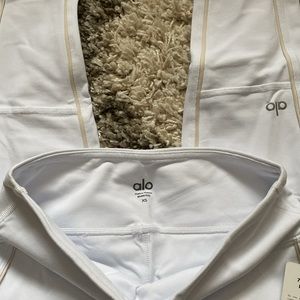 ✨ Brand new, never worn, white ALO yoga leggings in white with flattering bone colored detail along the leg!
