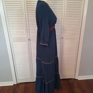 gorgeous maxi dress from flying tomato. pullover with gathered faux suede waist and plunging embroidered vneck. 3/4 sleeve with embroidered detail. skirt also has same embroidered detail and ruffle. size is small. armpit to Armpit is 15", waist is 12", shoulder to hem is 48". excellent condition