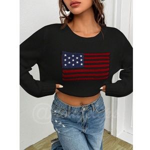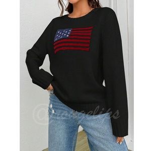 American Flag Knit Black Pullover Sweater Crew Neck Long Sleeve