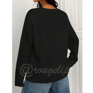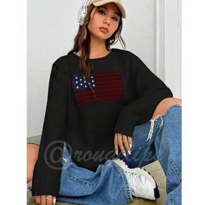 American Flag Knit Black Pullover Sweater Crew Neck Long Sleeve Drop Shoulder