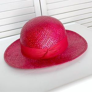 Vintage 80s red straw derby hat. Round top, medium brim with a red band.