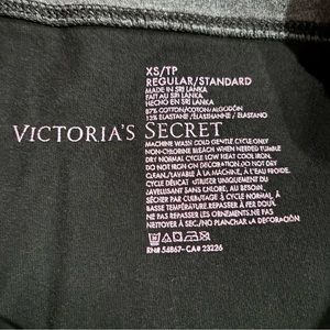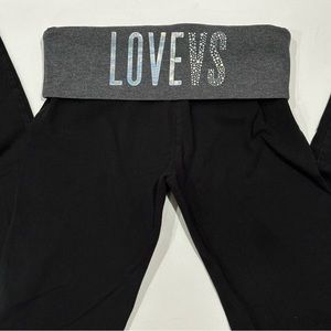 Description: Black yoga legging pants with gray waist band and silver sparkly / shimmery wording (“LOVE VS” on the back).
