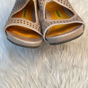 Tsubo Casius leather heels in putty. Peep-toe, slingback, asymetrical style with perforated holes in the leather. Side zipper closure. Leather covered heels.