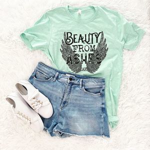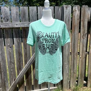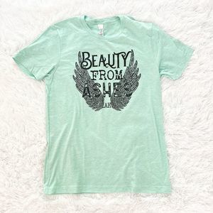 Isaiah 61:3 Beauty from Ashes graphic tee with wing details. Beautiful mint color and SUPER soft Bella + Canvas shirt. Perfect for errands, lounging, and more! Mannequin is a size 6 for reference with M shirt. Item is handmade so graphic location may vary slightly from picture.