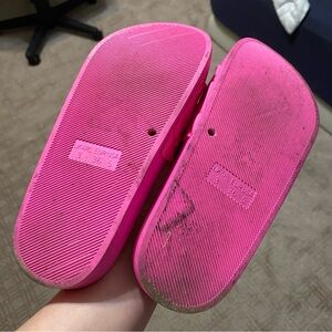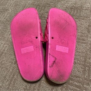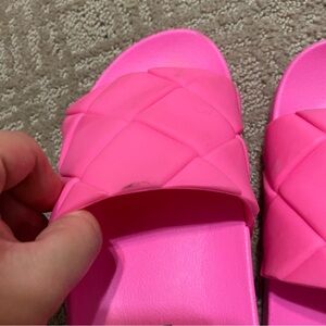 Steve Madden slides in very good pre owned condition, loved but still have lots of life left. Super fun bright pink color. There is some dirt around the outer sides of the shoes and some darker areas shown. Never attempted to clean or remove but I am sure they would clean up well! Selling as is. Very comfortable, true to size. Perfect for Summer - the beach, lounge, vacations, etc!