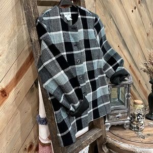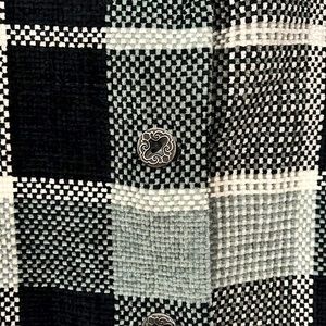 Sea foam green, black and white blazer. Small shoulder pads. Very good condition lightweight. Would look great with black pants or jeans. It almost has a gray feel. It would be great as an oversize jacket. I’m a large - large through the shoulders and it fits great, it’s not a real 16….but I tend to wear large roomy jackets. Hits around waiste.