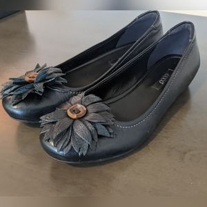 Soft leather flats, flower embellishments, box in excellent condition