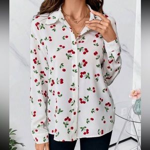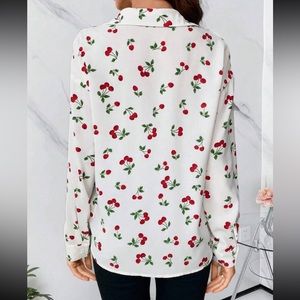 Classic Work Cherry Print Office Top Button Down Up Shirt Blouse White Red