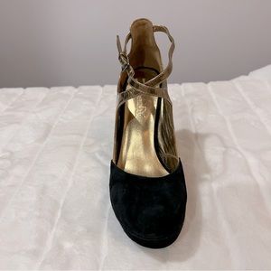 NEW DKNY Quinn Criss-Cross Strap Gold Leather & Black Suede Heels