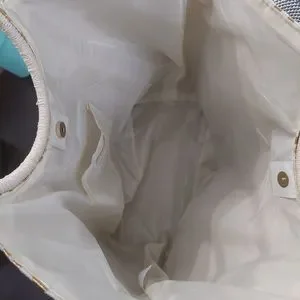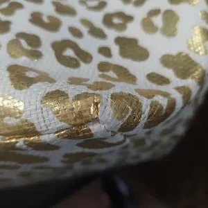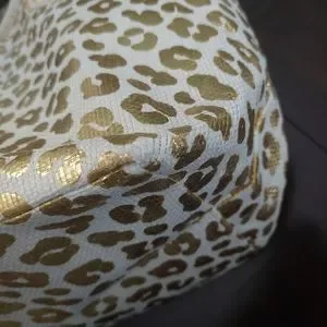 15 1/2 inches tall, 13 inches wide, and 7 1/4 inches in depth. This beautiful cream tote with gold cheetah print is the perfect style for whatever you need to carry. Whether it's a beach towel and lotion or your work computer and work accessories, works for all your necessities. Tote is in great condition.