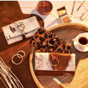 Style: MyraBag Cow Animal Print Hairon Fur Cowhide Leather Western Boho Bohemian Southwestern Yellowstone Rodeo Westernwear Boho Style O Ring Harness Ring Black Tan Wallet Bag