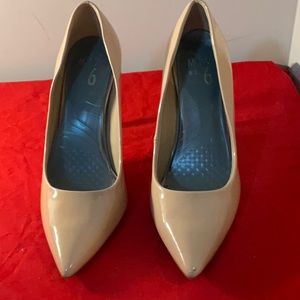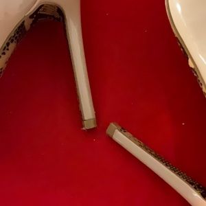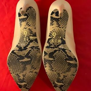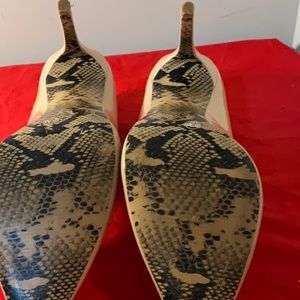 These tan patent leather shoes are very sexy! They have a pointed toe and a 4" stiletto heel. The bottom of the shoe as well as the inside of the heel are accented with a snake print design which gives these shoes a very chic look. These shoes are preloved and were only worn one time. They have minor scuff marks from being rubbed together and are in very good condition. Please see all photos.