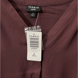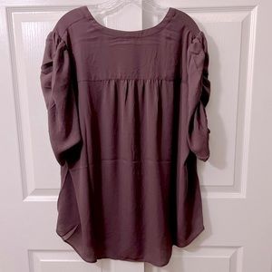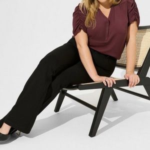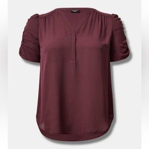 Harper Georgette ruched short sleeve blouse. Collarless neckline. Breathable, slightly sheer, minimum stretch woven fabric. 100% polyester. Machine wash cold. Dry low.