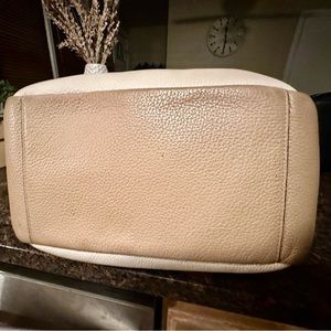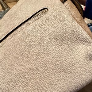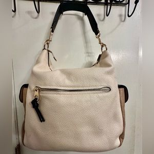 Color block Coach shoulder bag. Last 2 pictures show a small blemish on front of bag and a small mark on back. Otherwise bag is in good condition.