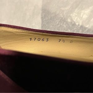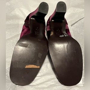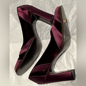 New! Never worn BOTTEGA VENETTA heels in a beautiful purple wine color. Satin and velvet. Wide heel for comfort. Mint condition except for slightly misshaped on one shoe due to improper storage. Should soften up and improve when worn. Or with shoe stretcher. One shoe on bottom has color missing from sticker being removed. Otherwise excellent condition and absolutely stunning shoes by Bottega Venetta! Please see photos.