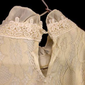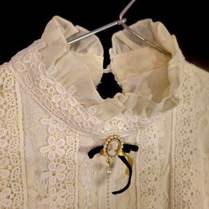 Vintage-Inspired White Lace Blouse, High ruffled neckline with bow and brooch