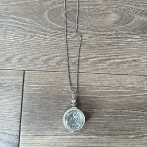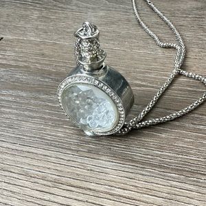 super unique silver pendant necklace with little bottle that’s full of cute little crystals! lots of elaborate rhinestone detailing on both the bottle and chain—roughly 16” long