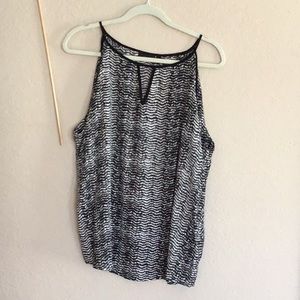 Black & white patterned layering tunic top, size Large. Measurements at 27 length & 40 bust. Front V neck detail.