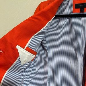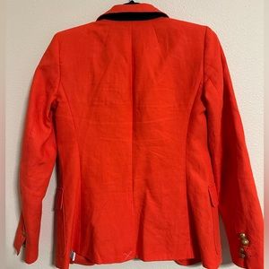 100% linen blazer with 2 front waist pockets and single outside breast pocket. 2 button front closure with ornate gold buttons. Smaller buttons on each sleeve. Fully lined with a white and blue stripe. Single interior button pocket. Very old money, collegiate, and sophisticated