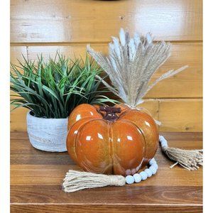 NEW CERAMIC PUMPKIN 8" Glazed Golden Orange with Brown Stem Fall Decor #4138