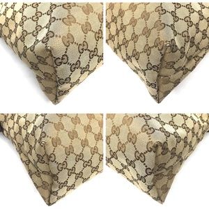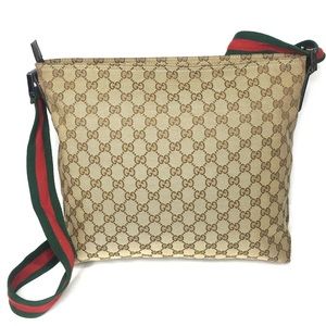 Monogram canvas with signature red & green ribbon strap and brown leather trims.