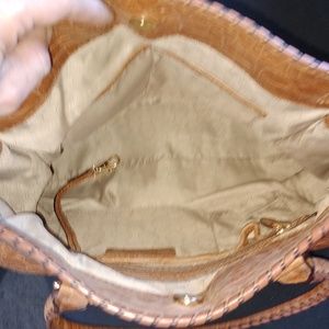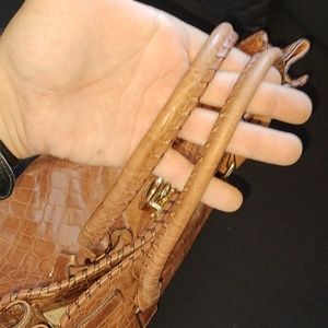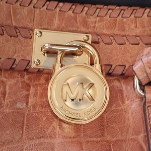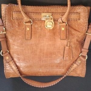 ABSOLUTELY GORGEOUS RARE Michael Michael Kors brown crock embossed leather Hamilton satchel bag with whipped stitching detailed trim and gold tone hardware. has an adjustable and removable leather shoulder strap(which most Hamilton have the non removable chain shoulder strap) with whipped stitching trim. 2 rolled leather satchel straps. feet on the bottom of the bag. has original Michael Kors lock and hidden key in the hang tag. magnetic snap closure. interior has the signature beige Michael Kors satin lining with 4slip pockets and a zipper pocket as well as a key lanyard. the bag is in beautiful condition inside and out. the whipped stitching detail and the removable and adjustable shoulder strap are what makes this bag so unique and rare