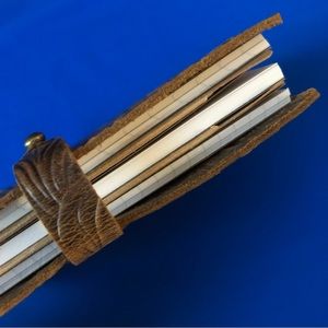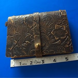Flower embossed distressed leather notepad. This is a beautiful brown little leather journal! It measures approximately 4” wide, 5.25” tall, and about 1” thick. Inside is 3 sections of papers: the first is lined, the second section is blank, the third section is graph grids. Each section is divided by a cardboard insert that has a pocket. This is an unused little journal that was removed from the protective plastic for these photos only. No brand listed. Due to not wanting to tamper with the inside pages, I do not know exactly how many pages in total there are. My best guess is 50-100 of each page type. The closure is a hole in the leather strap that inserts over the built in snap. Very beautiful textured leather journal!