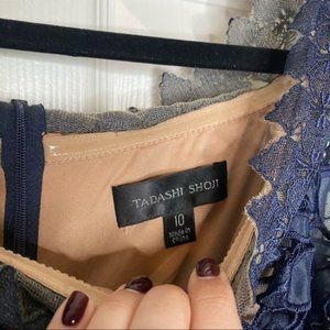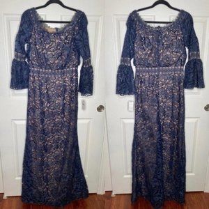 NWT Tadashi Shoji Navy Blue Nude Lace Off The Shoulder Maxi Dress Gown Size 10