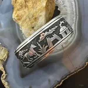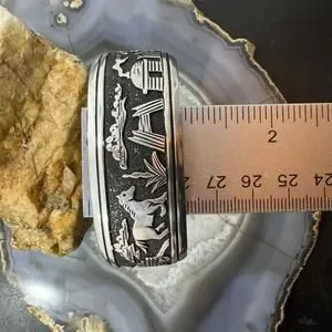 Sterling Silver Overlay Village Life Storyteller Unisex Bracelet, Signed by Native American Artists Tommy and Rosita Singer.
