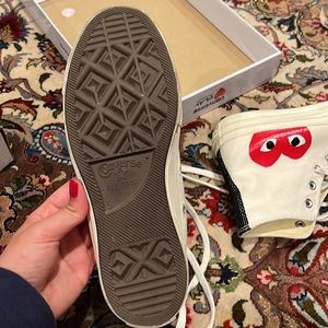 Like new converse high top. Worn a couple of times. Too small for me. Women’s 7 and men’s 5. See later pics for condition. Box included. Questions? Leave a comment below!