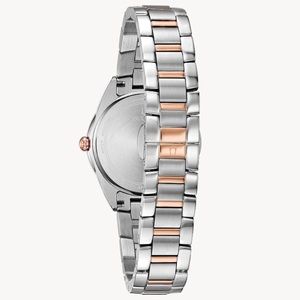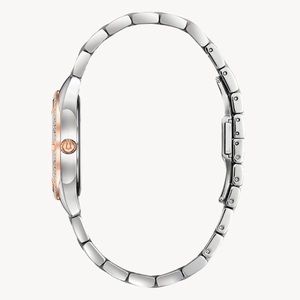 Slim stainless steel and rose gold-tone case set with 16 diamonds, lustrous bronze mother-of-pearl three-hand dial with 3 diamonds, domed sapphire crystal, stainless steel and rose gold-tone bracelet with push-button deployant clasp, quartz movement, and water resistance to 30 meters.